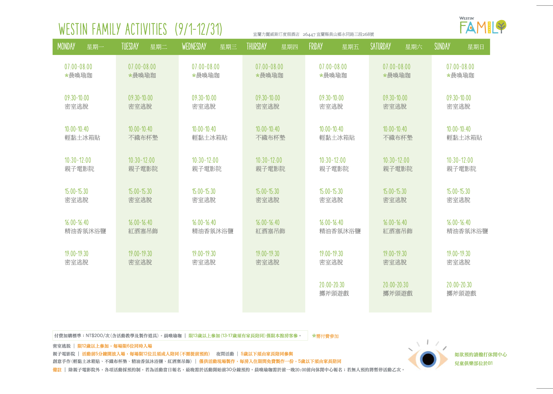 Westin每日活動表,每日提供兒童玩樂、各項體驗DIY創作,讓孩子們盡情的在Westin留下美好回憶。