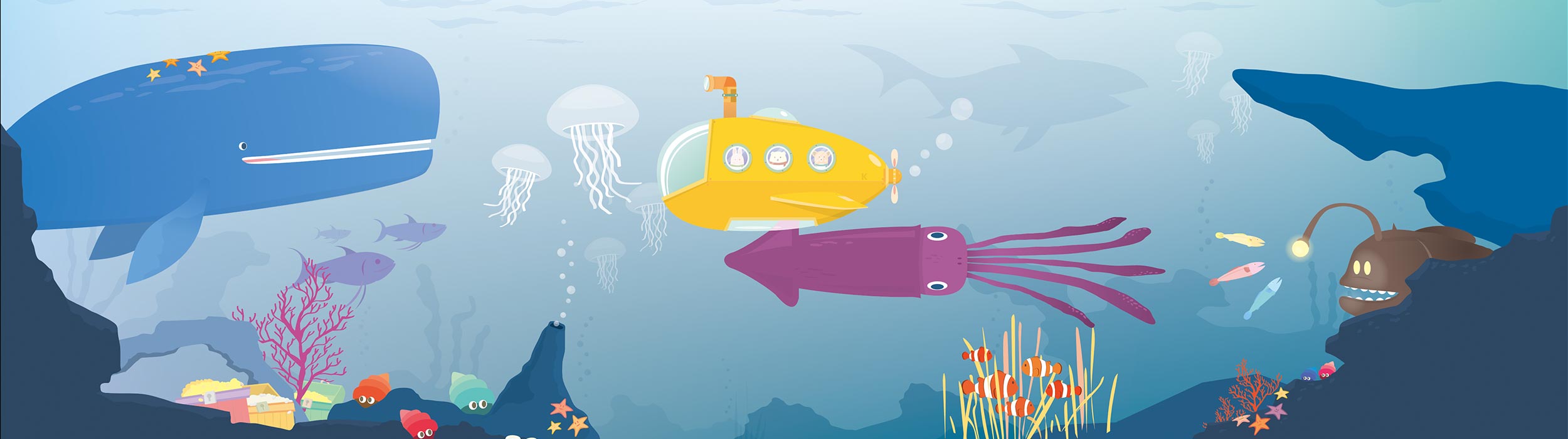 어린 모험가들이 노란색 잠수함을 타고 심해로 와서 탐험을 한다~ 어마어마한 고래를 봤다, 그리고 바다밑에 숨겨진 보물을 발견했다! 바다속에 사는 동물들은 누가 찾아왔는지 무척 궁금해 한다~
